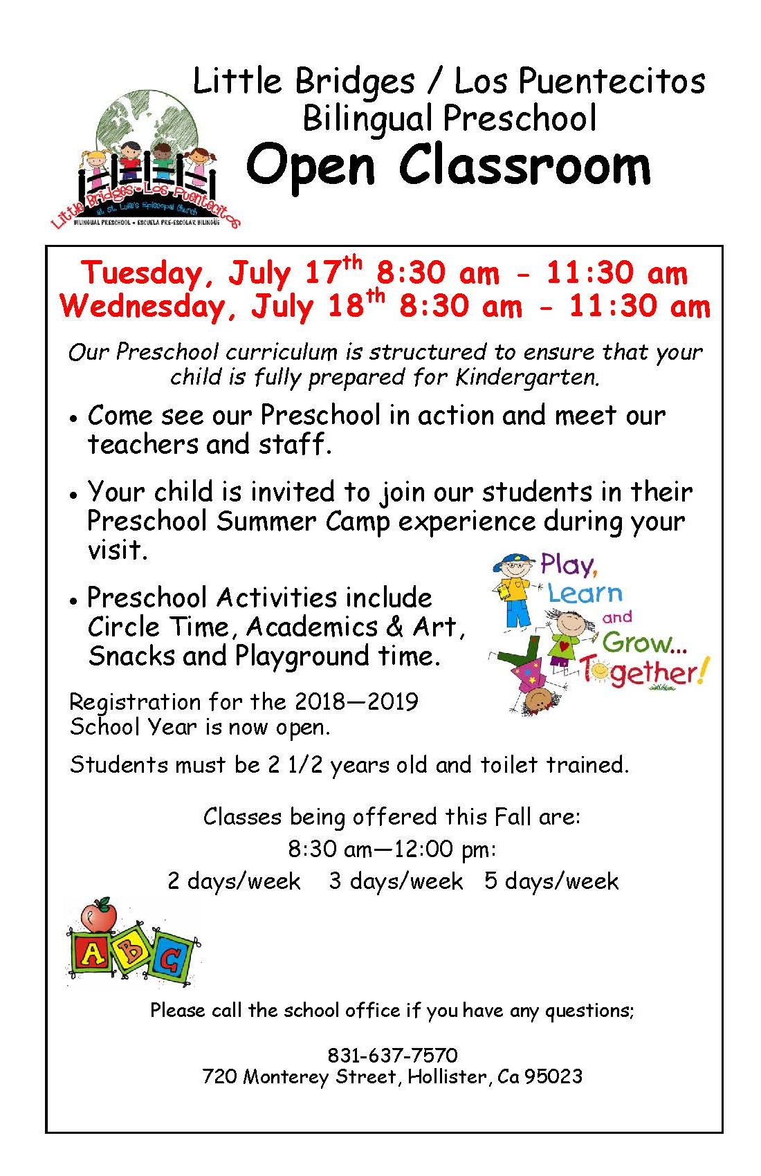 2018 July 17 & 18 Open Classroom July 17, 2018 – July 18, 2018 8:30 am to 11:30 am 0 Comments0 Comments Little Bridges Preschool at St Luke's 720 Monterey Street Hollister, CA 95023 Click this image to print the flyer in English and Spanish.